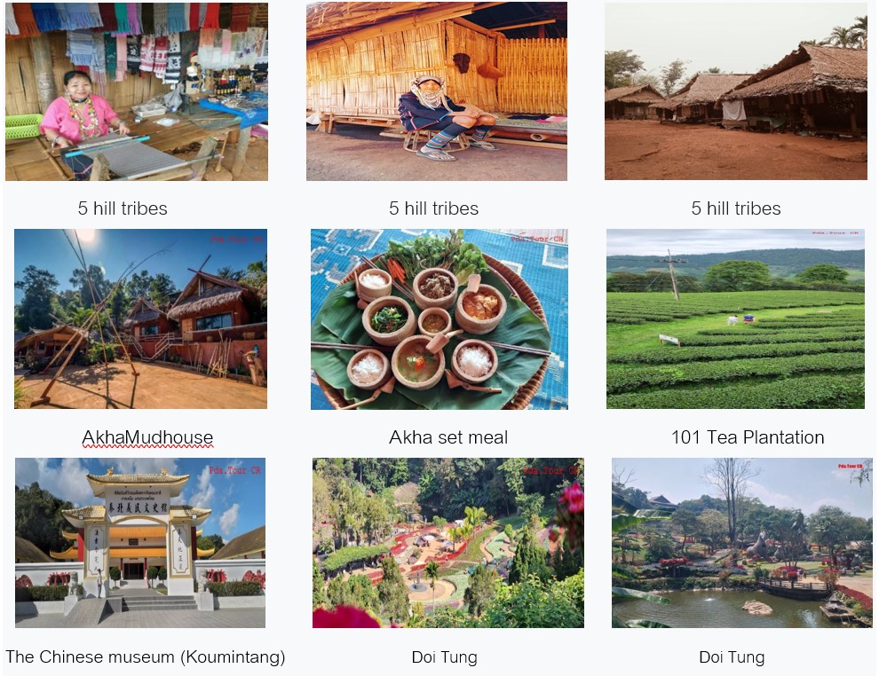 We will take you to visit to the 5 hill tribes that live here There will still be cultures of each tribe to be seen, such as hand weaving, traditional clothing of each tribe, characteristics of houses.Then, we will take you to Doi Mae Salong. Here you will experience the traditional Akha way of life at “Lor Yo” village. Ban Lor Yo is Akha Village and the houses are made from clay and become a mad houses.. Your lunch will be packed in bamboo containers. It is a tribal set menu or we called a traditional Akha tribal Khuntok. Then we will continue go to the tea factory. We will take you to taste a famous tea at the top of the mountain. You can see the beautiful nature.Then we will continue to Doi Mae Salong to see a beautiful 101 tea plantation among the mountains. Here you can learn more about the recent history of this area by visiting the Koumintang village of Santi Khiri at Mae Salong. Koumintang Village is inhabited by 7 tribes such as Yunnan Chinese, Yao (Mien), Akha , Lisu ,Lahu, Thai Yai and Thai Lue. Nowadays, all houses are modern and also the way of how they dress. This tour will take you to the Royal Project at Doi Tung, where there is a beautiful botanical garden that is opens to the public. There is a souvenir shop at Doi Tung that features handicrafts that is designated hand-woven by materials and ceramics. The crop replacement project to reduce opium production in this area and now there is many products that produces a variety of agricultural products like Arabika coffee and Macadamia. After this, we will then to Muang Chiang Rai and take you back to the hotel.